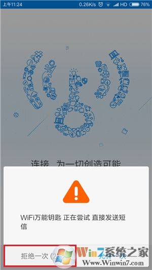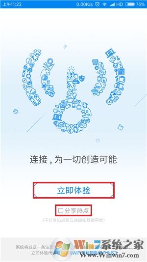 1.在手机端下载和安装,官方版本的WiFi万能钥匙软件并打开。然后在用户引导介绍部分左划三次,在最后一页记得先去掉“分享热点”复选框,然后再点击“立即体验”按钮继续,此时软件会尝试向指定号码发送短信,如果MIUI弹出警告提示,则需点击“拒绝一次”按钮。