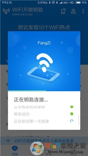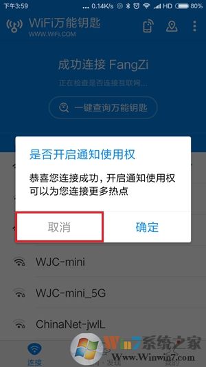 2.若此时手机没有通过热点连接到外网,则需要事先打开移动数据和WiFi功能。然后点击该软件“连接”界面中,最上方蓝色区域的“一键查询万能钥匙”按钮,此时软件会结合云端数据,搜索附近被其他用户分享过的热点,若找到对应的热点SSID名称后面会有一个蓝色的“钥匙”图标,然后需要点击信号最强的一个WiFi热点,接着点击“钥匙连接”按钮尝试快速连入,通常只需1-5秒钟的时间就能成功连上,如果是安装后第一次连接成功,还会弹出开启通知使用权的提示,为了避免自带的广告消息造成骚扰,此时建议点击“取消”按钮。