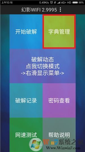 在手机端下载和安装幻影WiFi软件并打开,同时确保其WiFi功能已经开启,并删除所有会在该环境中自动连接的热点,以免对破解过程造成影响,然后在用户引导介绍部分左划三次,进入最后一页后点击“开始使用”按钮。接着在弹出的说明提示框中点击“确认”或“取消”按钮将其关闭,然后在主界面中点击“字典管理”并进入字典设置界面。