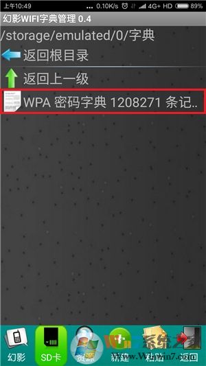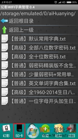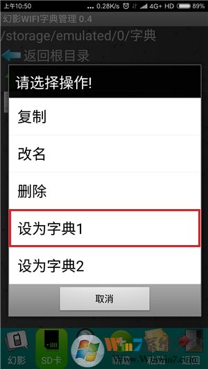 软件在此处已经提供了8个弱密码字典,如果要使用内存中已下载的字典文件,可以点击下方的“SD卡”选项卡,然后打开字典文件的存储位置,选择并长按一个要使用的字典文件,接着在弹出的操作菜单中点击“设为字典1”项即可,同理还可继续指定字典2文件。