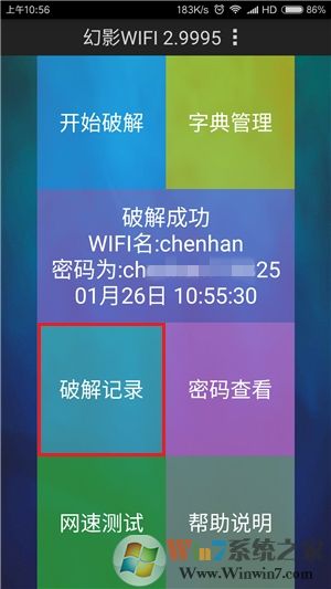 若字典中的某行密码,尝试连接目标热点成功,将立即停止破解并发出声音和推送通知。此时软件还会弹出破解成功的提示,点击“确认”或‘取消’按钮可将其关闭。此外在主界面第二行的蓝紫色区域中,或点击“破解记录”都可以查看上一次破解出的热点名称和密码。