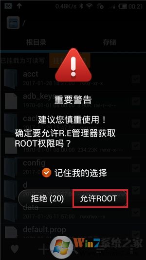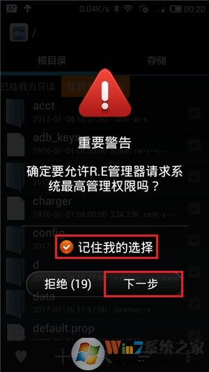 ①直接弹出警告提示界面,此时勾选“记住我的选择”,并点击四次“下一步”和一次“允许ROOT”按钮。