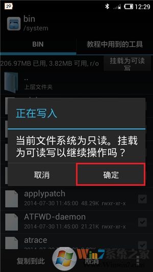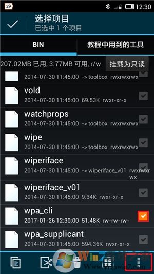 由于安卓默认不支持验证PIN码连接无线网络,故必须将相关的驱动功能植入系统中,否则无法通过该软件实现暴破PIN码。先在文末附件中下载名称为“wpa_cli”的内核文件,到手机虚拟内存的任意位置中,然后打开R.E管理器并在右边的“存储”一栏中,找到其所在位置后点击该文件右侧的勾将其选中,接着点击底端左侧第一个“复制”按钮,然后在左边的“根目录”一栏中,找到“/system/bin/”目录并点击“复制到此”将其拷贝到该位置。如果当前文件系统挂载为只读状态,此时会弹出修改挂载为可读写的提示框,直接点击“确定”键即可。