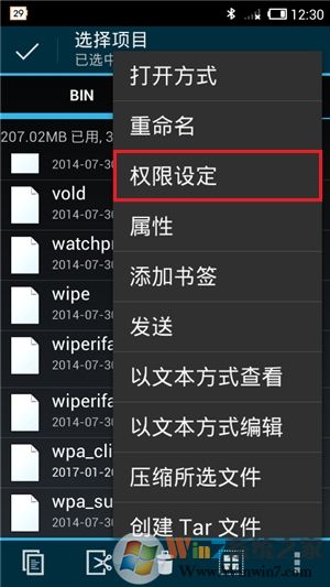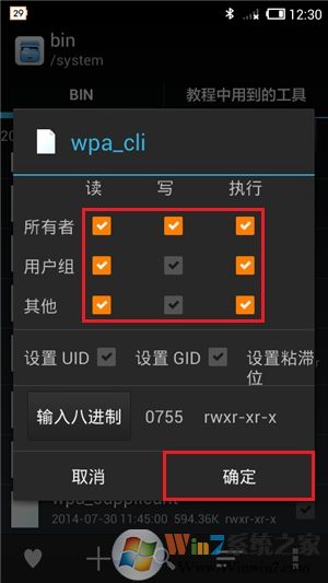 然后还需要为该驱动内核文件,设置正确的权限以便能够被软件正常访问和调用。在“/system/bin/”目录下点击“wpa_cli”文件右侧的勾将其选中,然后点击底端最右侧的“...”按钮,接着点击其中的“权限设定”菜单项,并在弹出的权限设置框中,设为允许本机全部用户有“读”和“执行”的权限,并只为文件所有者开启“写”的权限,即为该文件的权限属性设置为0755(rwxr-xr-x),最后点击“确定”键后重启手机该功能驱动即可生效。