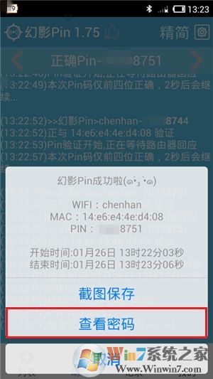 为有效缩短时间并提高效率,软件会对8位Pin数值的前后4位,同时依次分段进行递增和递减的尝试,当Pin的前4位正确后会发出声音提醒,此时软件将前4位固定,并继续依次尝试后4位数字。若已找到正确的Pin码并成功连接热点,将立即停止破解并发出声音和推送通知,软件还会弹出破解成功的提示,此时点击“查看密码”或切换到“记录”页面中,即可查看该热点的PIN码及无线密码,若以后热点主人突然修改了无线密码,也可在软件中直接输入该PIN码,再次尝试破解连接并重新获得密码。