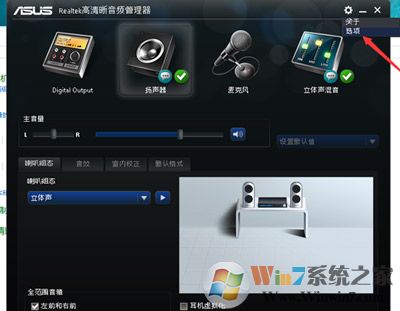 4、在Realtek高清晰音频管理器界面中,点击设置的图标,弹出菜单栏,我们选择“选项”,如下图所示: