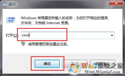 1、点击“WIN+R”组合键,快速打开“运行”窗口,在里面输入“cmd”字符命令,再点击回车打开命令提示符窗口。