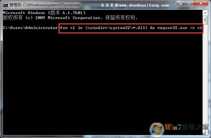 “for %1 in (%windir%\system32\*.dll) do regsvr32.exe /s %1”,接着就点击回车键,这样Win7系统会将“%windir%\system32\”下面全部的DLL文件再注册一遍,耐心等待一会,用时可能会长一点,一般需要8分钟时间。
