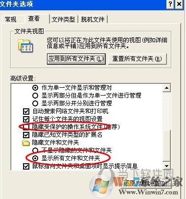 2、打开文件夹选项,取消“隐藏受保护的操作系统文件”的勾选,然后选中“显示所有文件和文件夹”