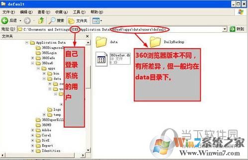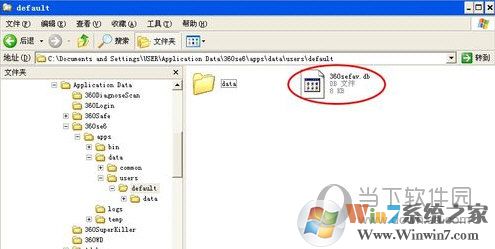 3、依次展开360浏览器的目录 C:\Documents andSettings\USER\Application Data\360se6\apps\data\users\default