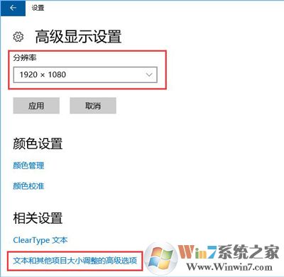 3、确保当前分辨率是1920*1080,然后点击下面的【文本和其他项目大小调整的高级选项】,如图: