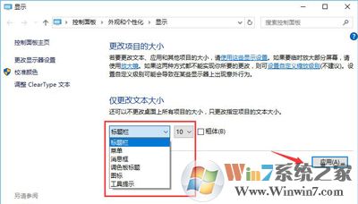 5、修改完缩放比后,在“仅更改文本大小”将所有项目的文本大小统统由9改为10 点击【应用】即可!