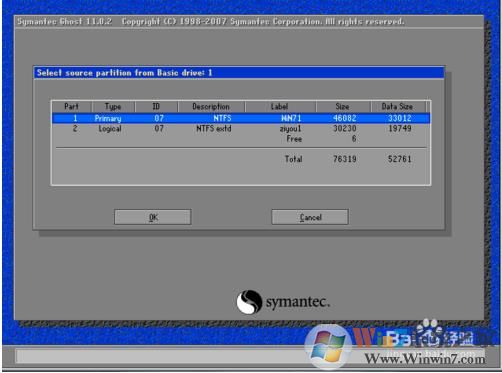 3、这里我们看到两个分区,如我们需要把第一个分区作为被拷贝对象,那就选择第一个分区,再按键【Tab键】换按 OK。