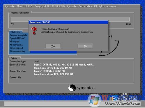 5、我们看到Ghost进入对拷页面后,弹出窗口提示将覆盖目标数据硬盘,点击“YES”即可开始对拷数据。