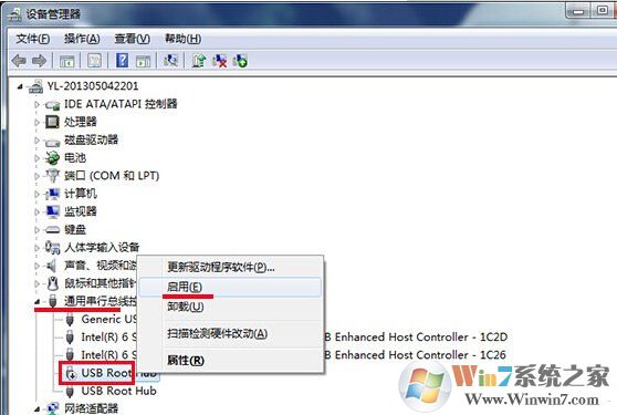 在系统的设备管理器中我们查看“通用串行总线控制”这一项里面似乎否出现有红框向下的箭头,如果有那么就需要重新启用USB接口的驱动程序,一般这种情况就得以完美解决了。