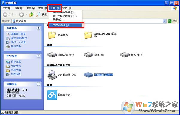 1、双击打开我的电脑,在弹出的窗口中点击“工具”菜单,再点击“文件夹选项”,如下图所示: