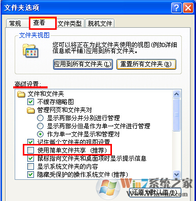 2、在弹出的文件夹选项窗口中点击“查看”栏目,在高级设置中找到“使用简单文件共享(推荐)”将其前面的勾选去掉,再点击“应用——确定”按钮,如下图所示: