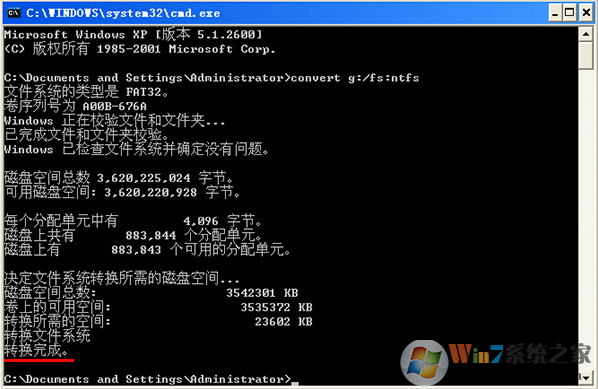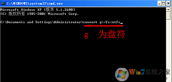 4、在弹出的管理员dos命令窗口中输入“convert g:/fs:ntfs”按回车键执行,注意:这里g为当前u盘在电脑中的盘符,如下图所示: