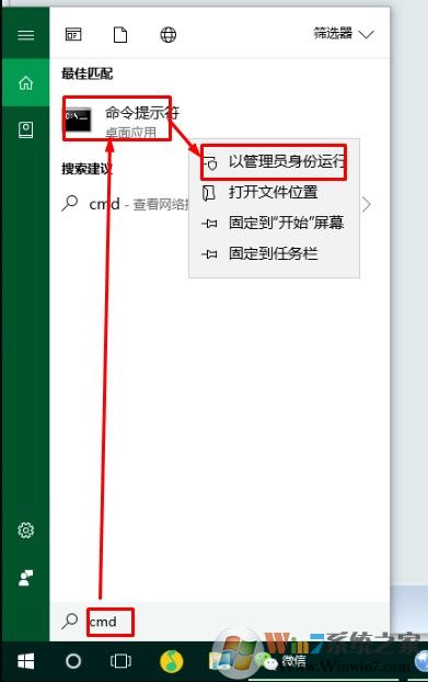 1、win+s打开小娜输入cmd并右键选择已管理员身份运行。