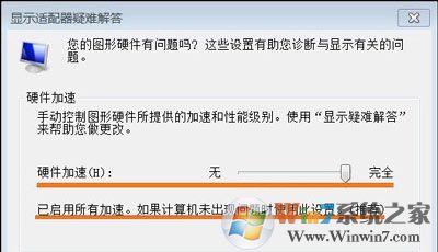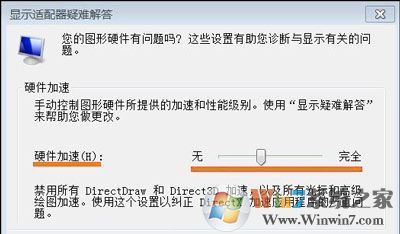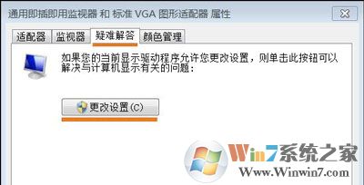 4、现在弹出了一个新的小窗口在上面切换到【疑难解答】选项卡然后窗口上点击【更改设置】按钮即可打开硬件加速窗口通过调整滑块来对硬件进行加速了。