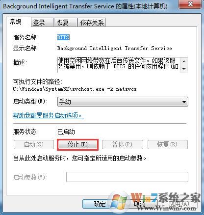 5、注意,该服务是后台智能传输服务,我们只需要停止它即可,而不要将其禁止。