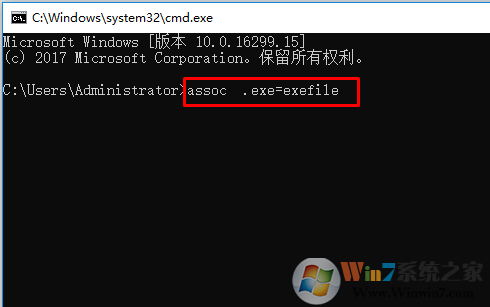 2、输入assoc .exe=exefile〔assoc 与.exe 之间要有空格〕重新建立关联!