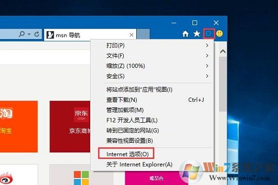 2、打开IE浏览器,点击设置按钮,选择“Internet选项”;