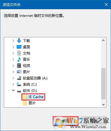 5、在浏览文件夹窗口中,选择刚才新建的 IE Cache 文件夹,点击确定,