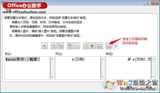 3、自定义页眉或者页脚:点击自定义页眉或者页脚以后,会弹出一个新的对话框,在一个新的对话框中,可以根据功能按钮自定义页眉或者页脚。