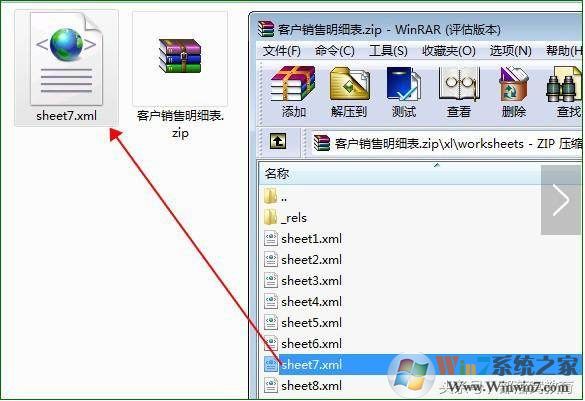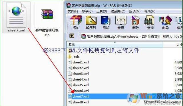 4、把改好的sheet7.xml文件复制到zip压缩包中替换;