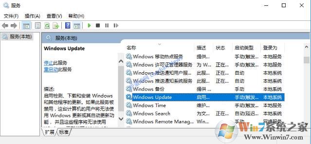 2、在开始菜单右侧的搜索框中输入关键词服务, 打开后寻找 Windows Update 的服务项并右键点击属性。