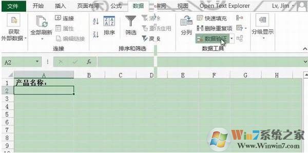 第一步、打开Excel2013,选定A2单元格,点击“数据验证”;
