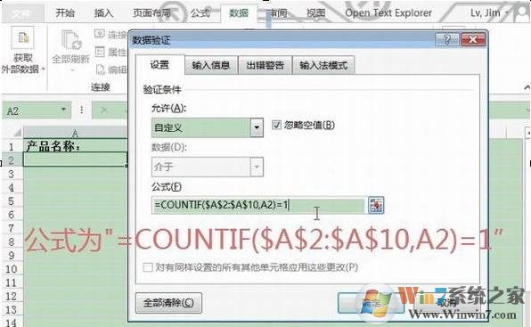第二步、在“设置”栏目下,允许选择“自定义”,并输入下图公式;