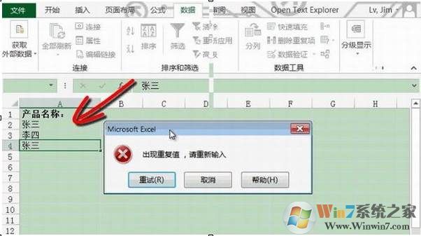第五步、这时如果有输入重复值,就会弹出警告。