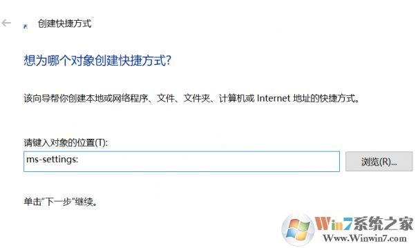 先在桌面空白的地方用鼠标新建快捷方式,在“请键入对象的位置”(不是你女朋友的名字,不要理解错了)输入:ms-settings: 点击下一步