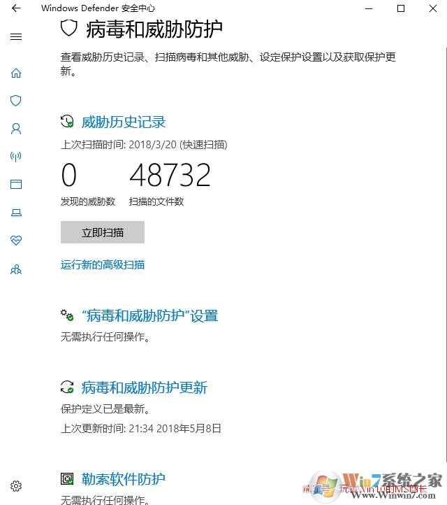 1、《Windows Defender安全中心》的“病毒和威胁防护”设置界面的底部有一个专门的“勒索软件防护”设置项。如图: