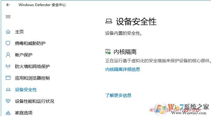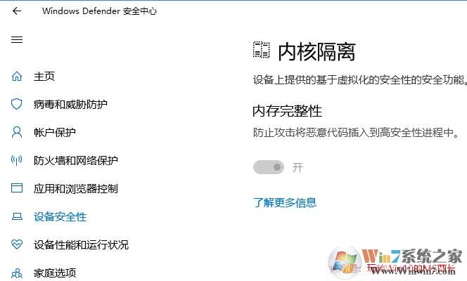 2、点击“内核隔离详细信息”打开“内核隔离”设置页面。如图: