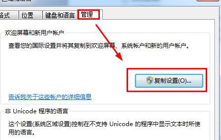 2、在区域和语言界面点开管理,【复制设置】,如图: