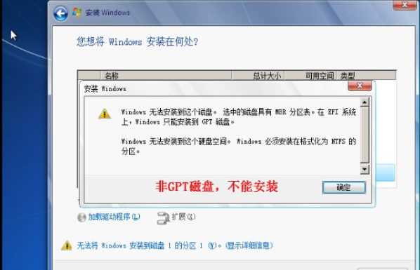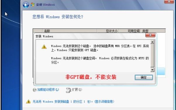 错误提示2:windows 无法安装到这个磁盘,选中的磁盘采用GPT分区形式;