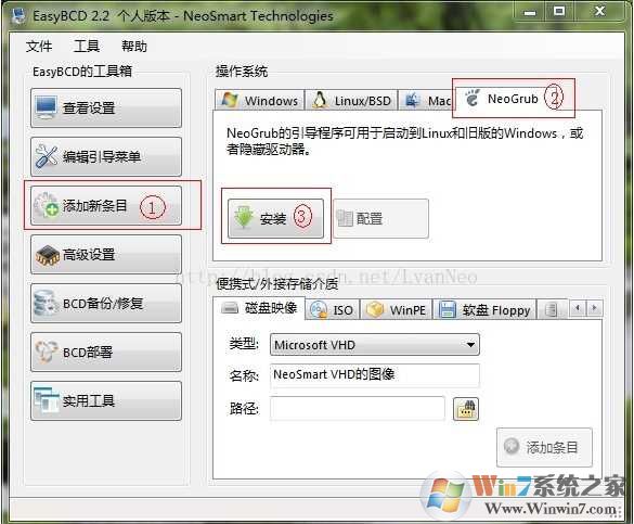 4. 运行EasyBCD,“添加新条目”->“NeoGrub”->“安装”。如下图: