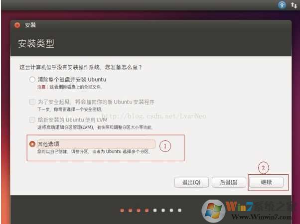 10. 根据自己系统的具体情况进行分区。如果由ubuntu启动引导win7,则安装启动引导器的设备可以不用更改,默认即可。如下所示: