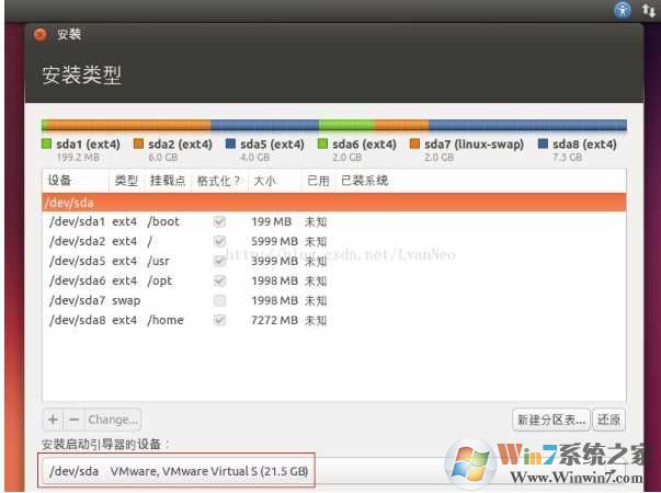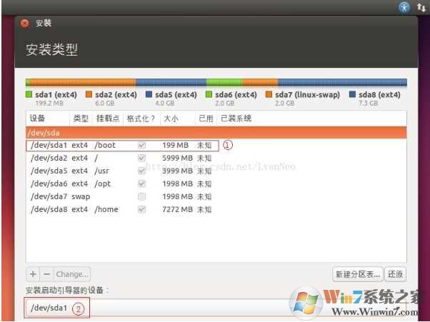 如果想由win7启动引导ubuntu,则安装启动引导器的设备应选择/boot所在的分区。如下图所示: