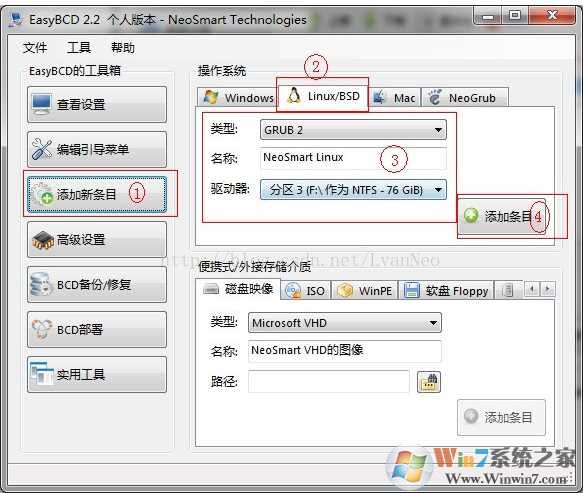 13. 运行EasyBCD,“添加新条目”->“Linux/BCD”。