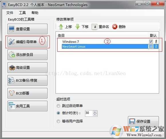 15. 在EasyBCD中,“选中编辑引导菜单”可对引导菜单进行管理,可看到刚才添加的ubuntu引导。如下图所示: