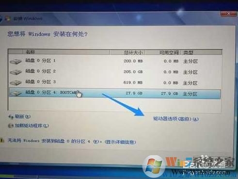 10、进入到Win7安装程序后,下一步下一步之后,来到系统分区界面,这时需要注意。在安装系统分区界面里,选择bootcamp分区并点击“驱动器高级”选项,如图所示