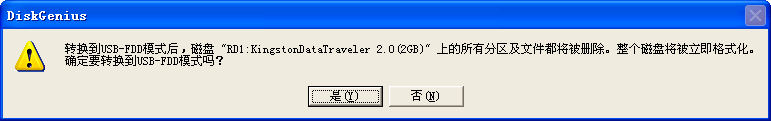 首先选择U盘或移动硬盘,然后点击菜单“工具->制作USB-FDD启动盘”项。程序显示如下的警告提示。请注意在转换前备份重要数据。