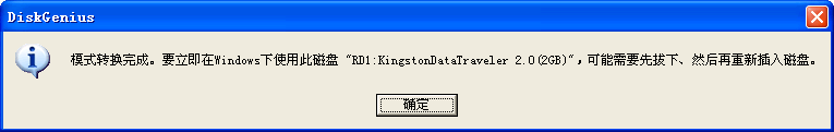 在对话框中选择文件系统类型后就可以点击“格式化”按钮。当然也可以先设置簇大小、设置卷标。与格式化分区的操作方法相同。点击“格式化”按钮后程序立即开始转换操作。 然后向磁盘中复制DOS启动文件。转换完成,程序弹出如下提示。请先拔下移动盘,再重新插入。