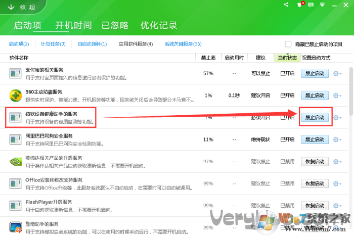 如果您安装了360安全卫士,那么打开它,在【优化加速】——【启动项】——【应用软件服务】找到微软设备健康助手的服务,禁用它
