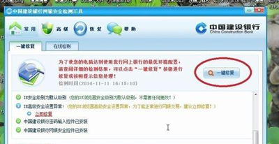 2、安装后,打开检测软件,将目前系统存在的问题“一键修复”一下,如果交易时还是出现那个提示框,那么请选择“一键检测”,这时执行的是在线的环境检测,观察是否有存在问题;