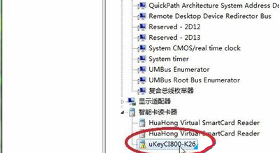 3、我们还会遇到提示说“获取网银盾序列号插件不可用”,这时你若打开电脑的设备管理器,你会发现,在下面的“智能读卡器”那里存在有一个黄色感叹号的U盘驱动未正确安装;